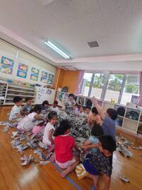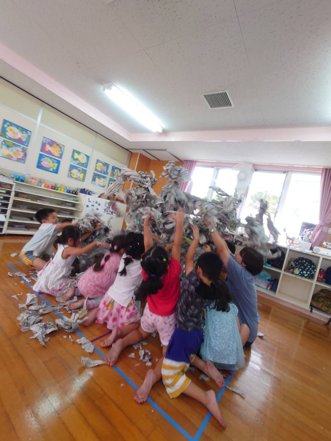 せーのっ!それーっとみんなで気持を合わせ、集めた新聞紙を高く飛ばしていました。