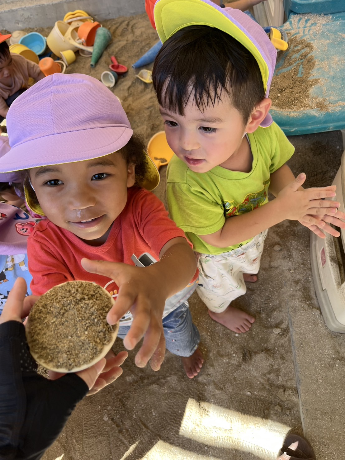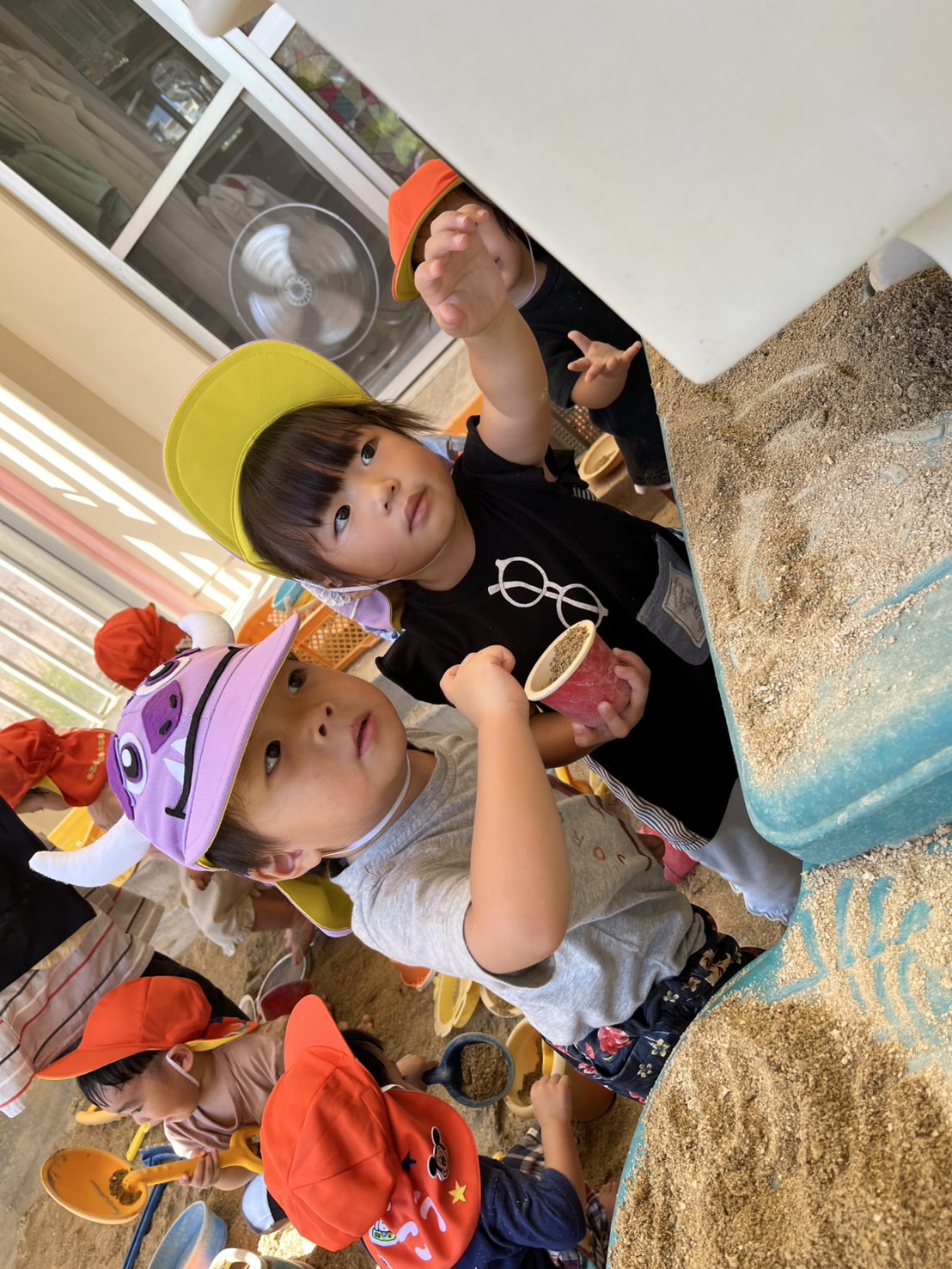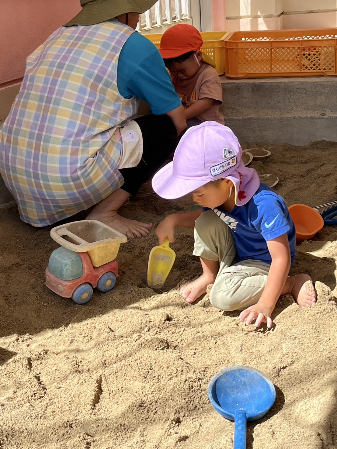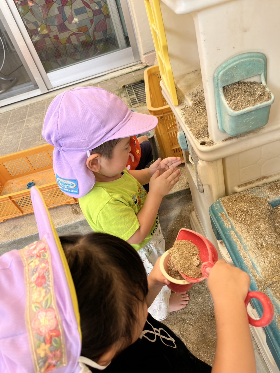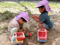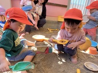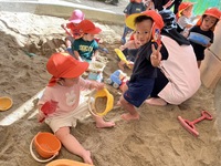 あい組さんとわかば組さんが、砂場や園庭で楽しそうに遊んでいました。