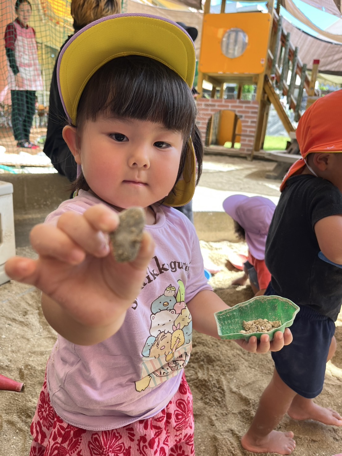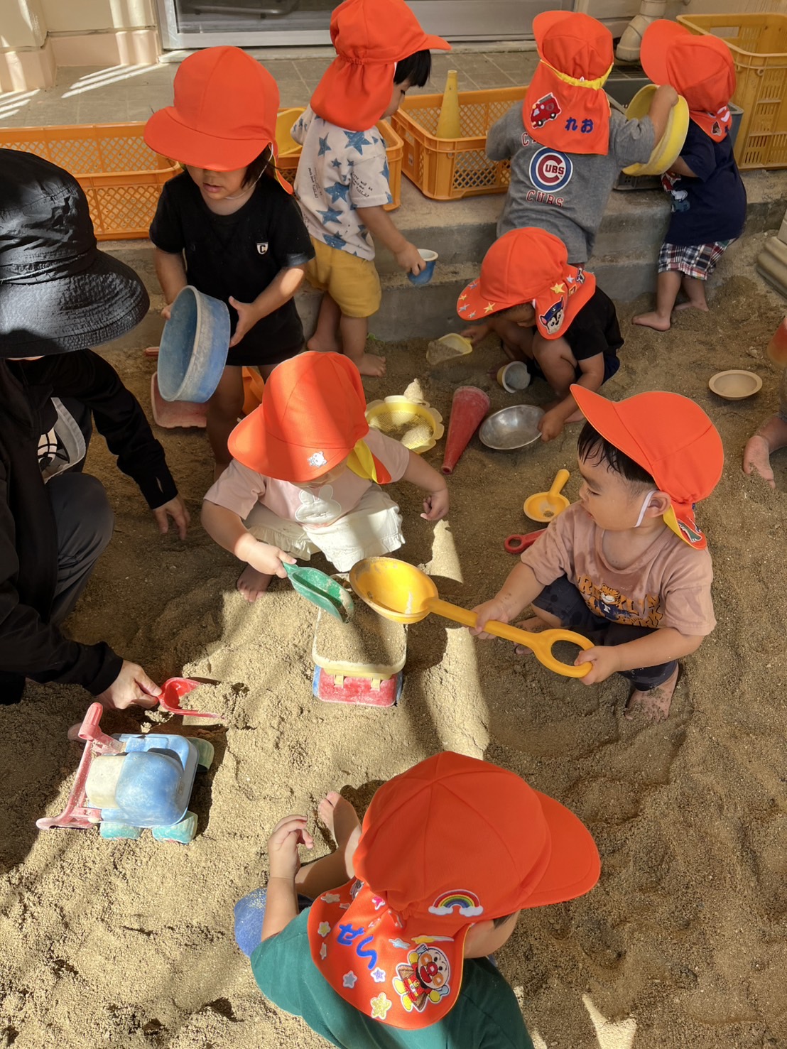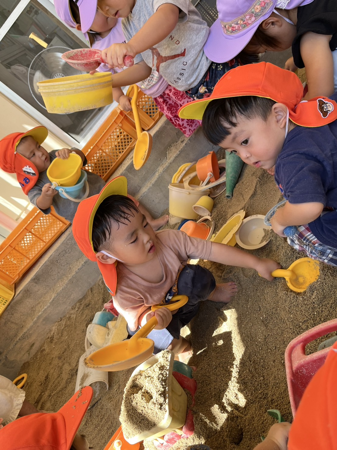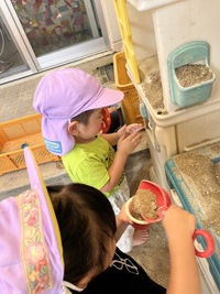 あい組さんとわかば組さんが、砂場や園庭で楽しそうに遊んでいました。