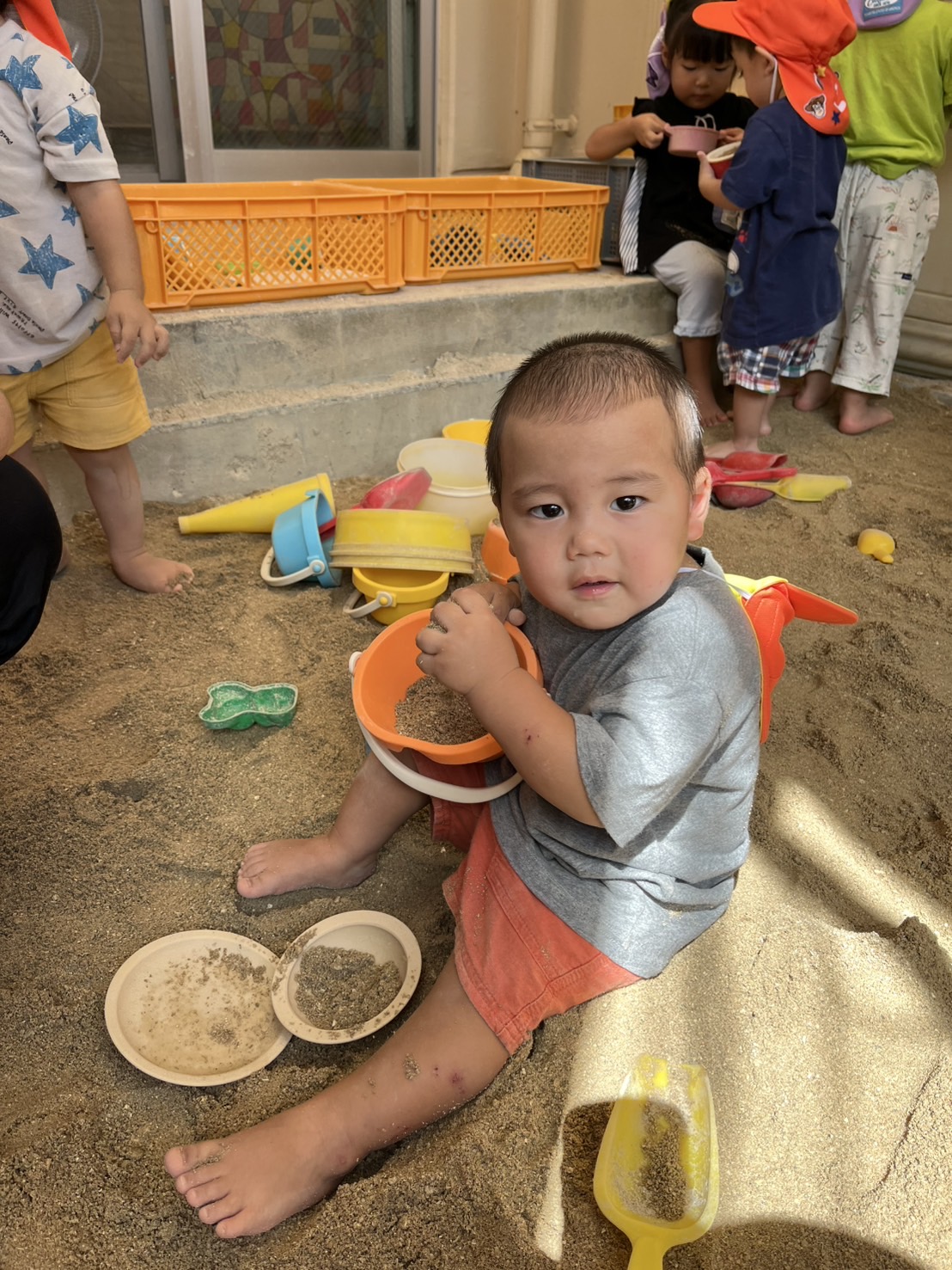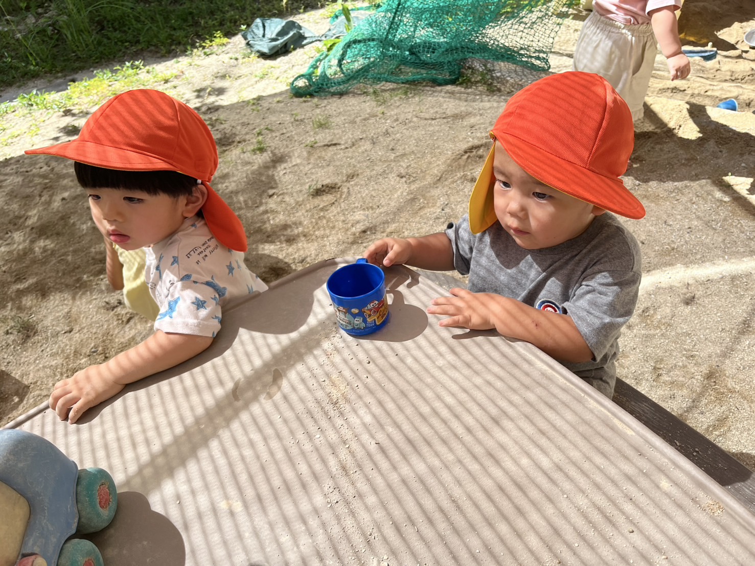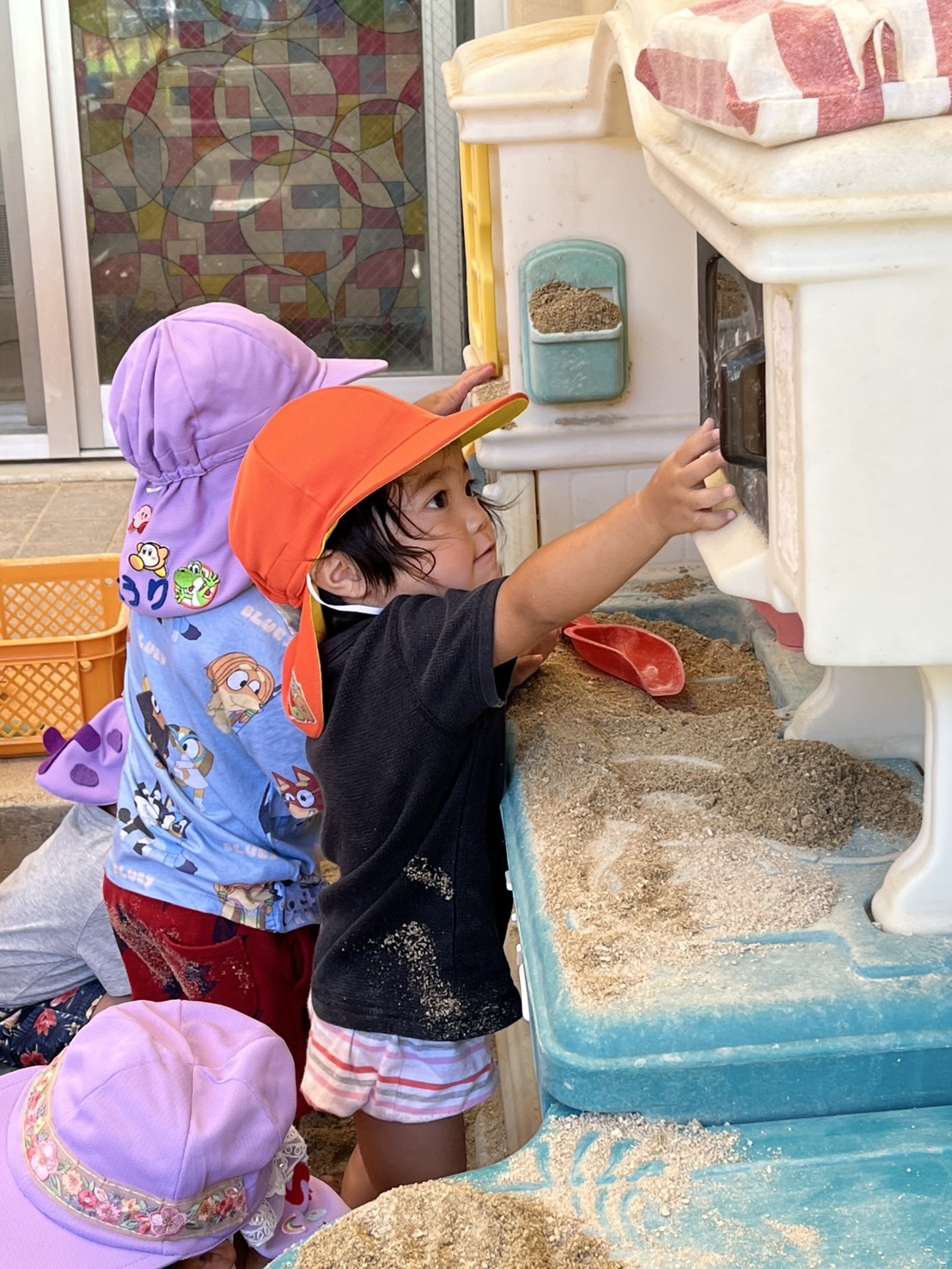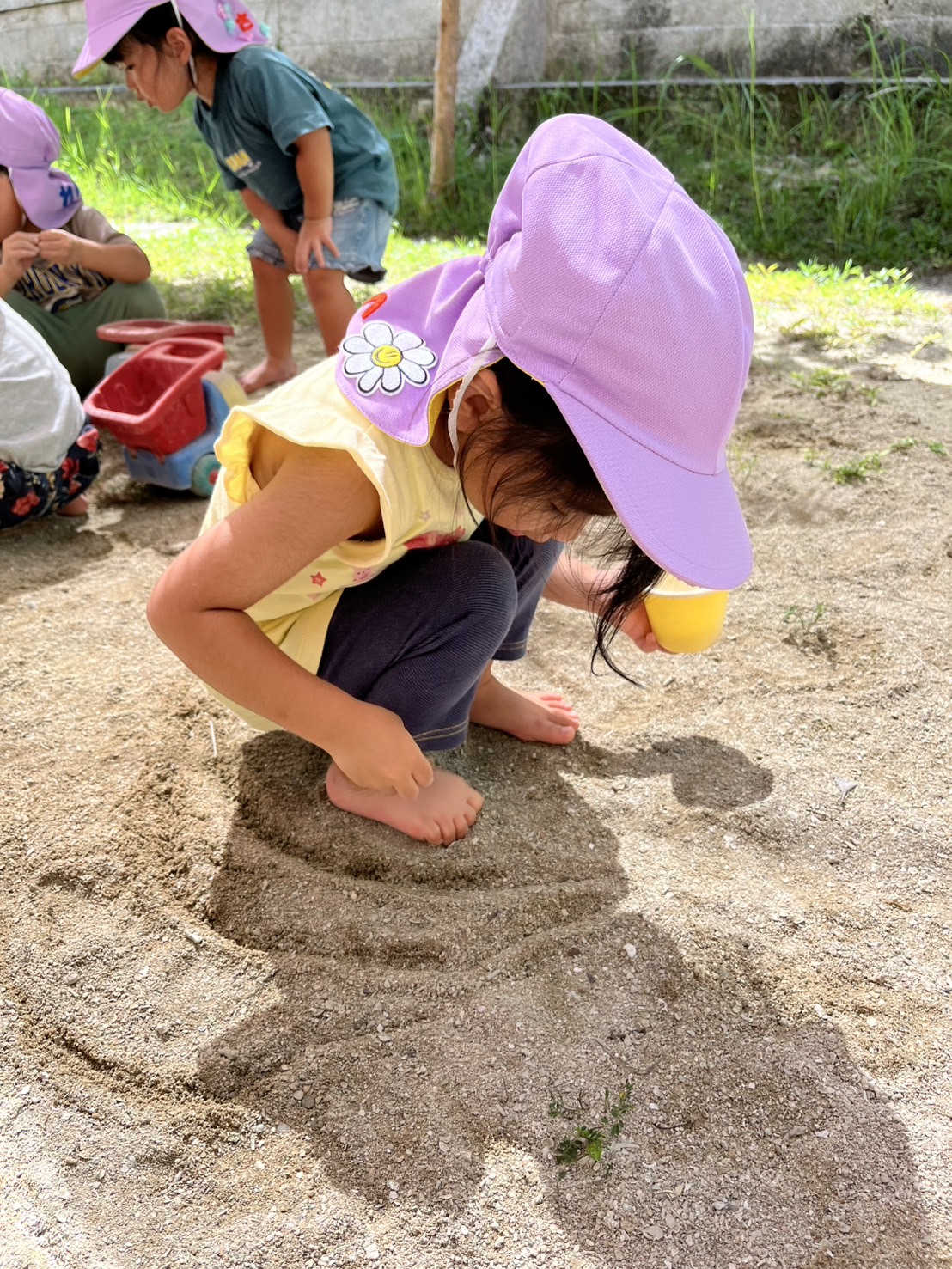 あい組さんとわかば組さんが、砂場や園庭で楽しそうに遊んでいました。