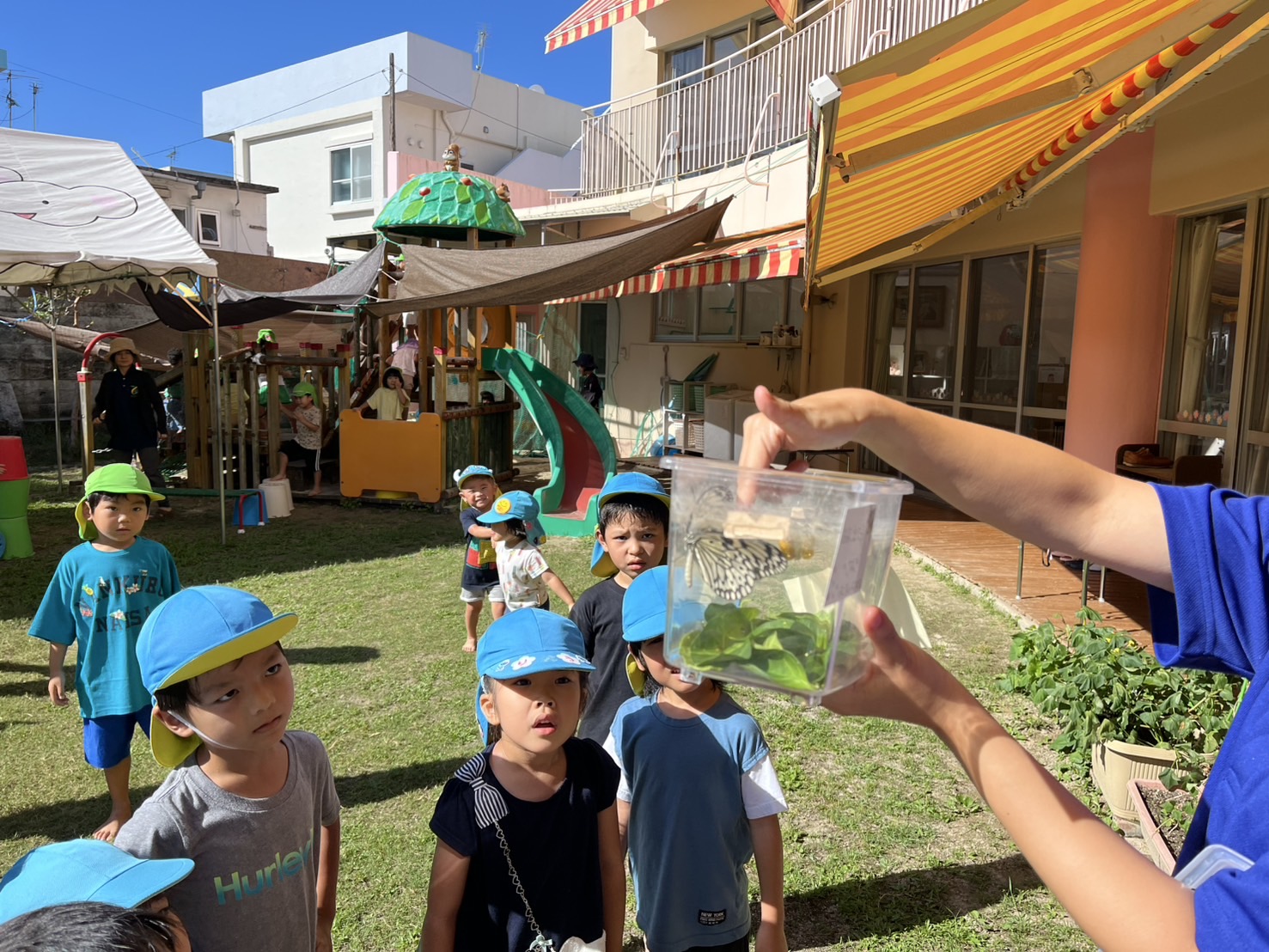 その1つが今朝、孵化して蝶になっていました。大きなきれいな羽にすごい~と子ども達は