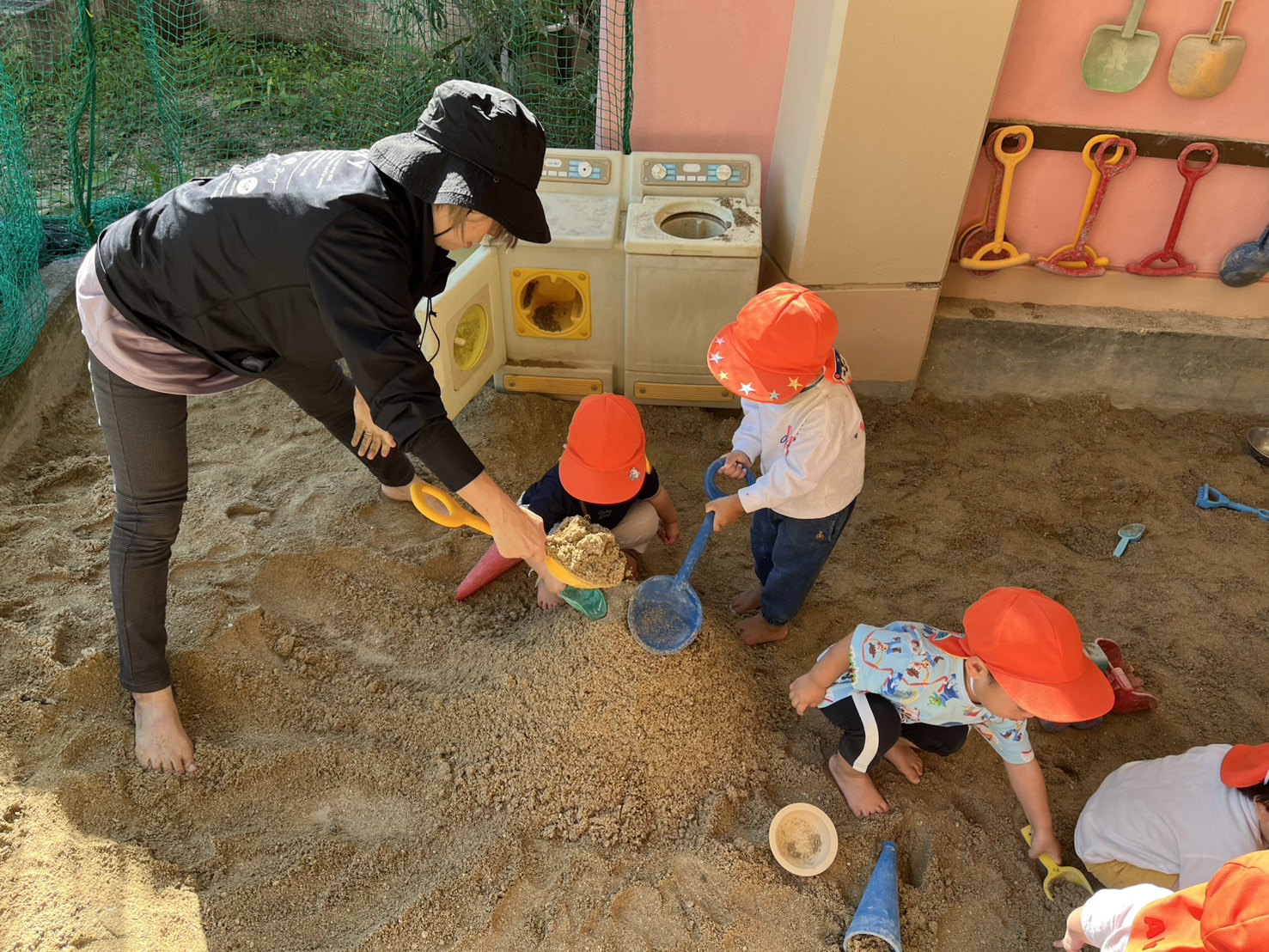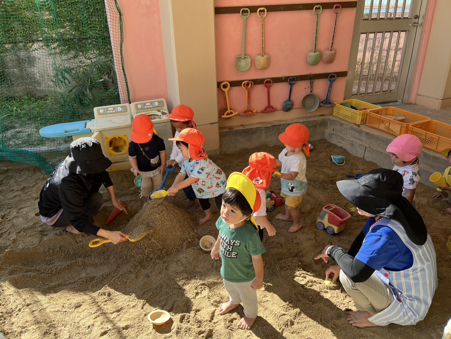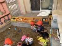 今日は、久しぶりのぽかぽか陽気で園庭で遊んでいるクラスや運動あそびで