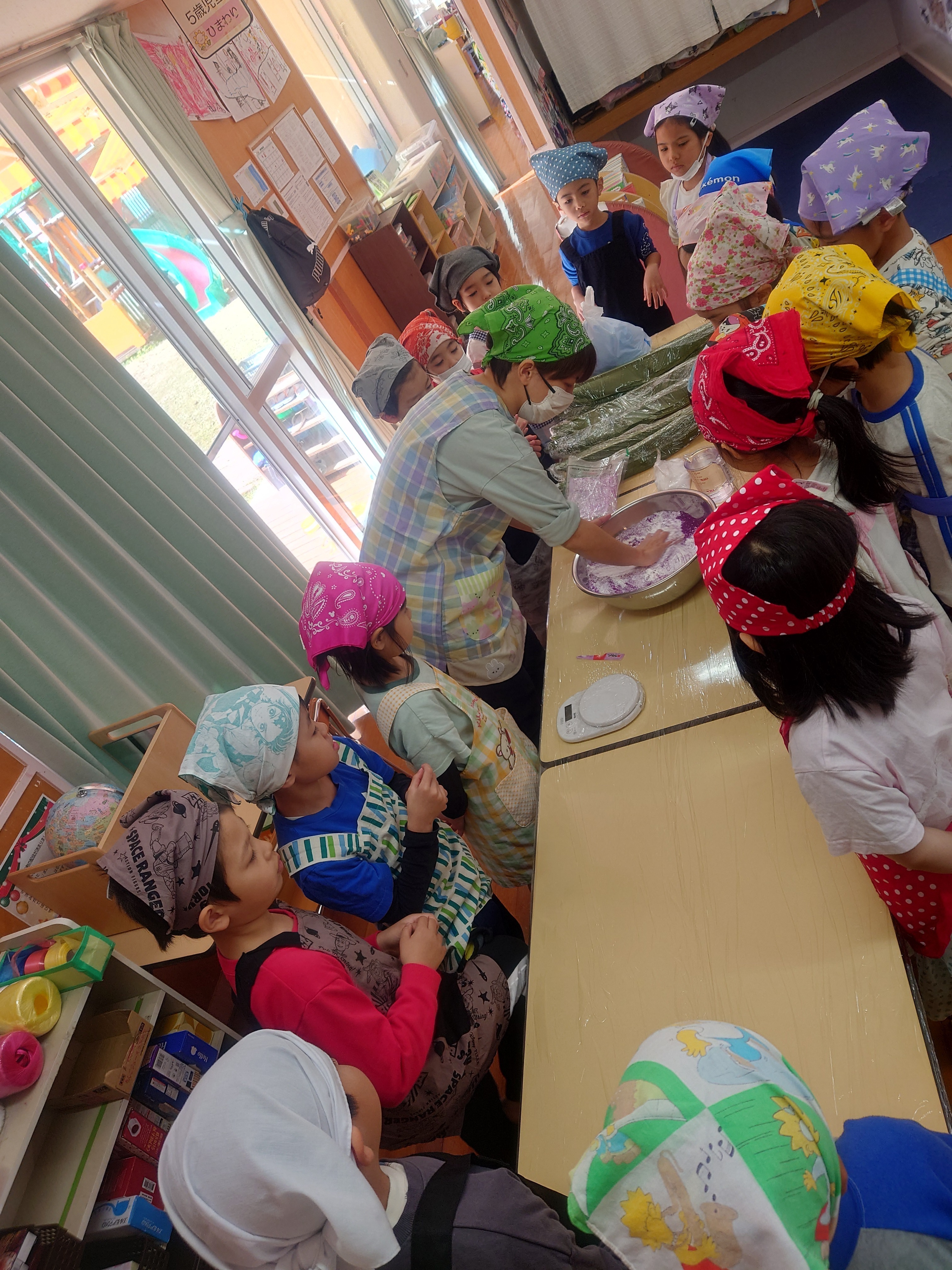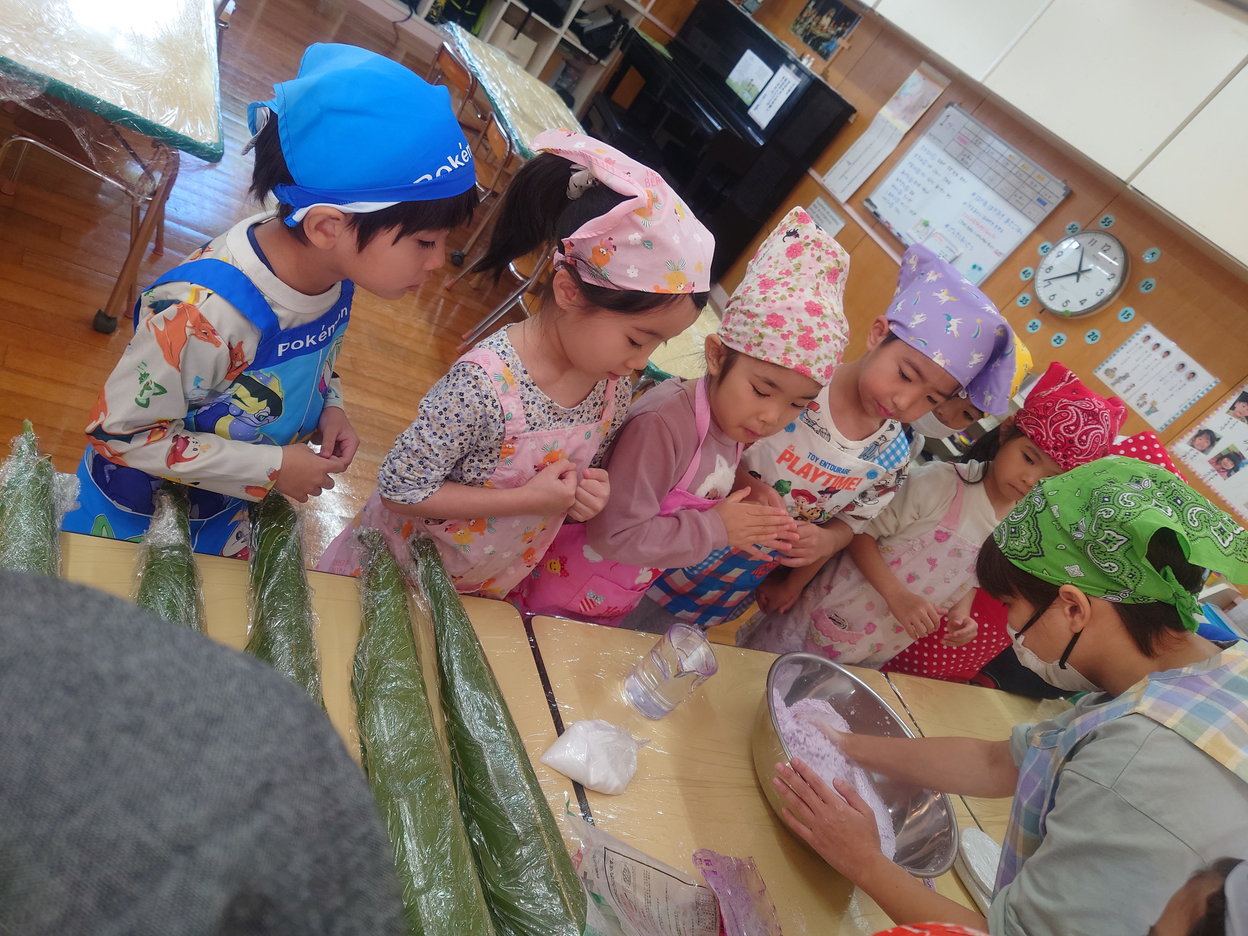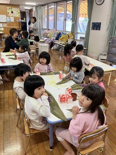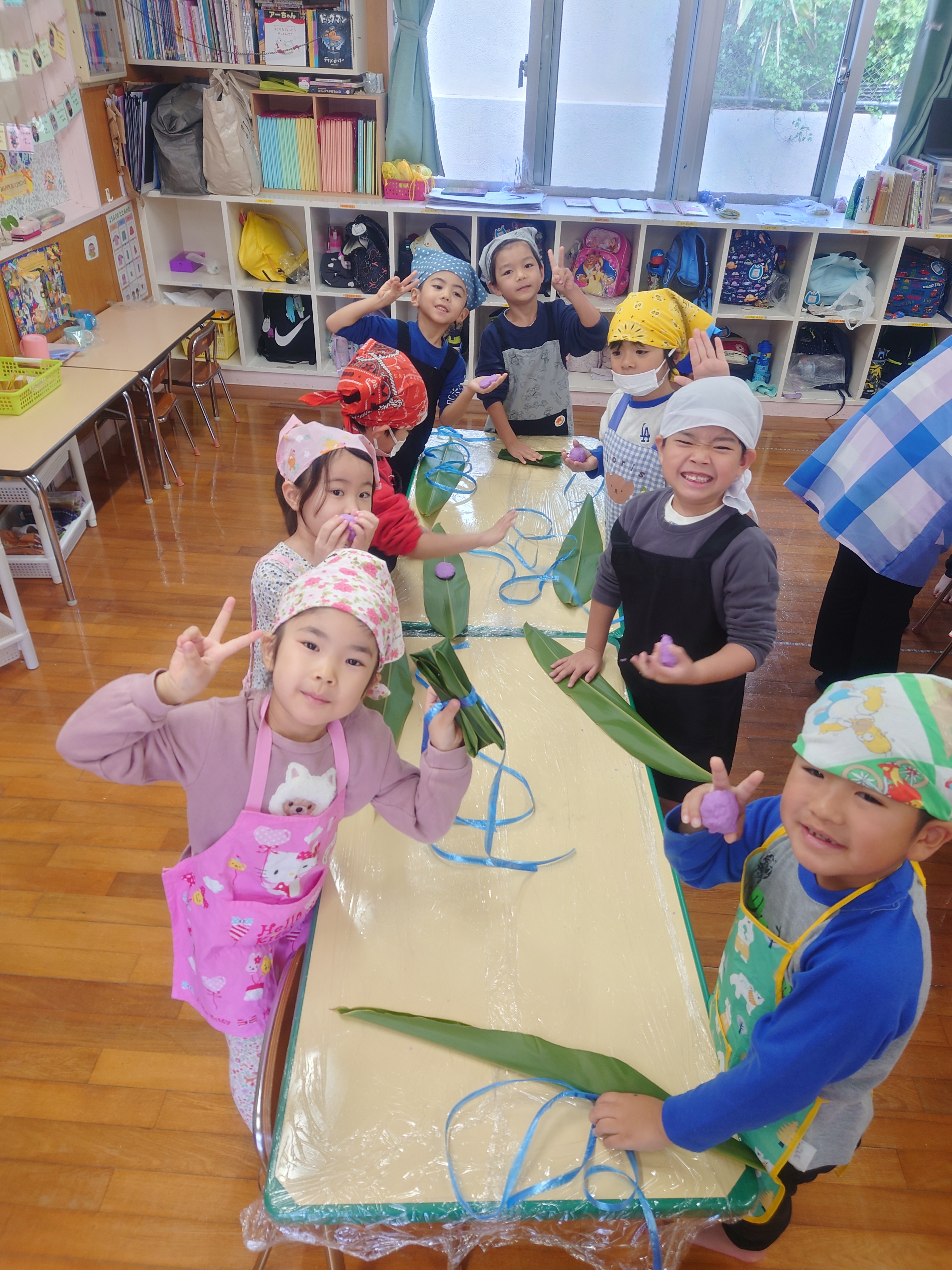 「おにムーチー」の紙芝居を見た後、各クラスでムーチー作り(ムーチー作りごっこ)を