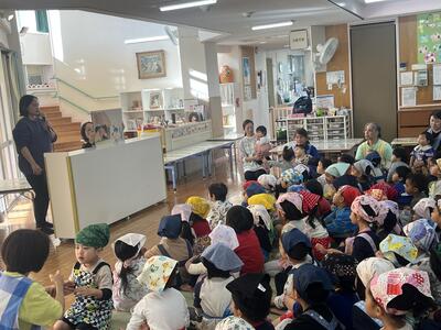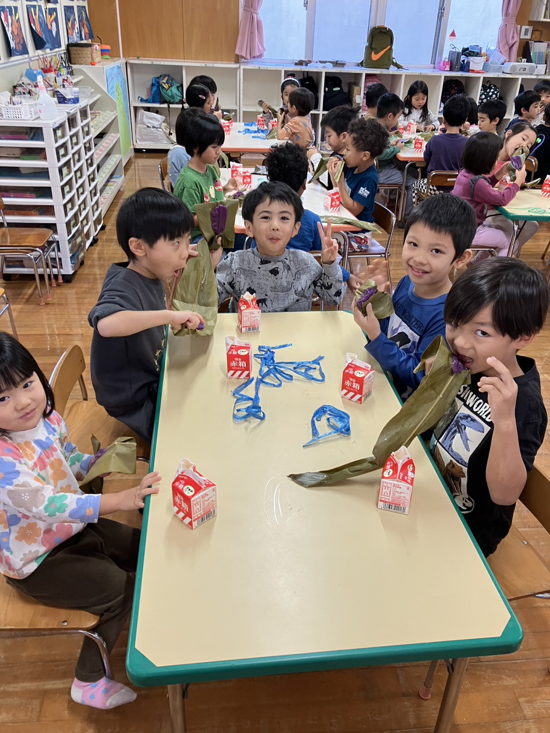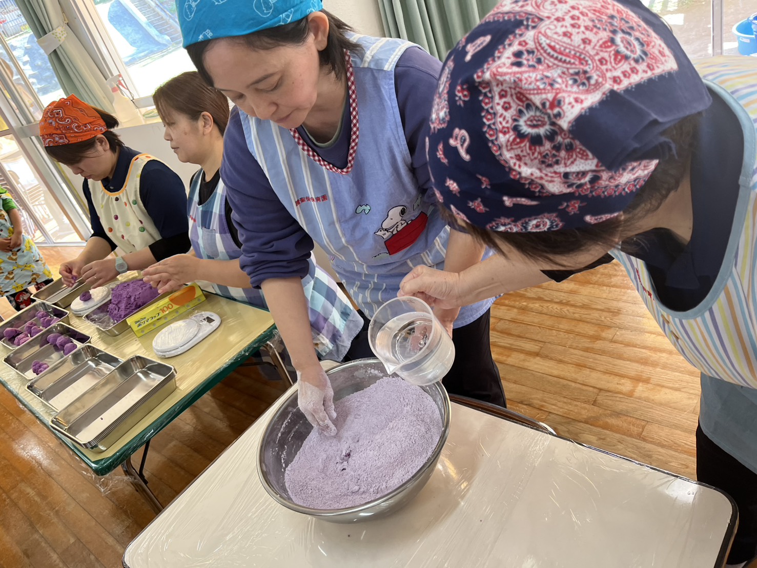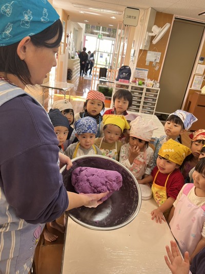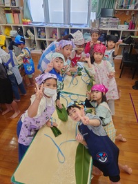「おにムーチー」の紙芝居を見た後、各クラスでムーチー作り(ムーチー作りごっこ)を