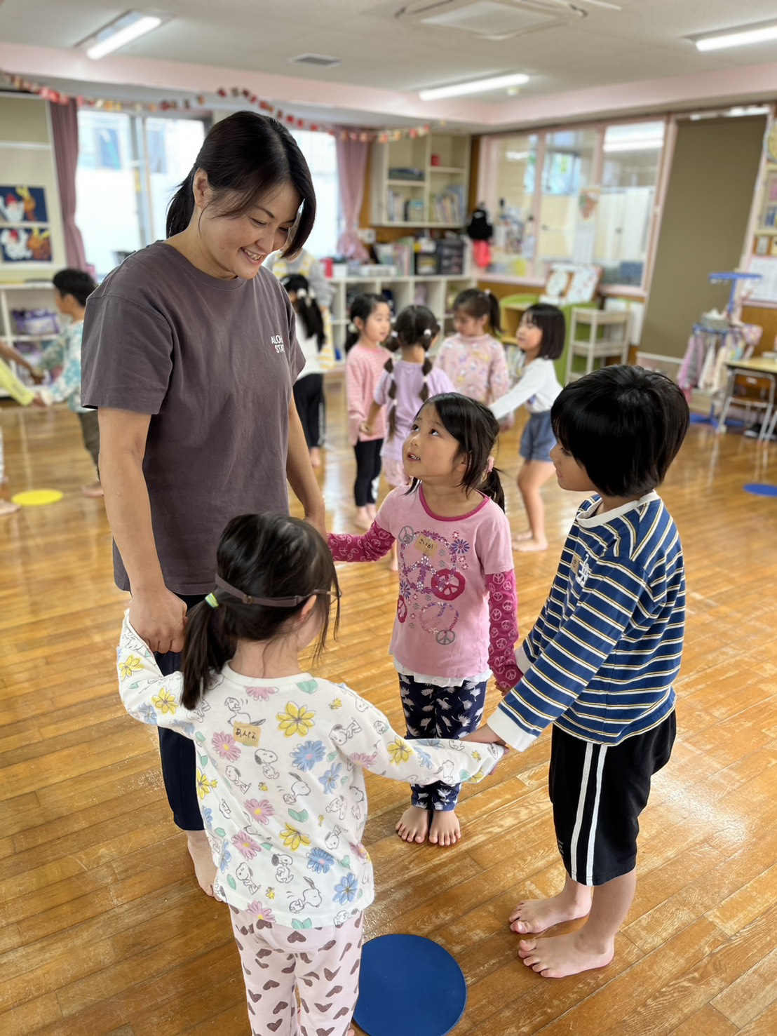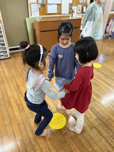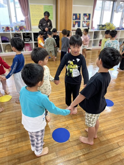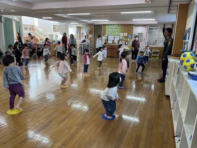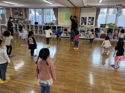 ☆ゆり・ひまわり組:手をつないだまま、あつき先生が言った方向へジャンプ!同じ方向にジャンプできるかな