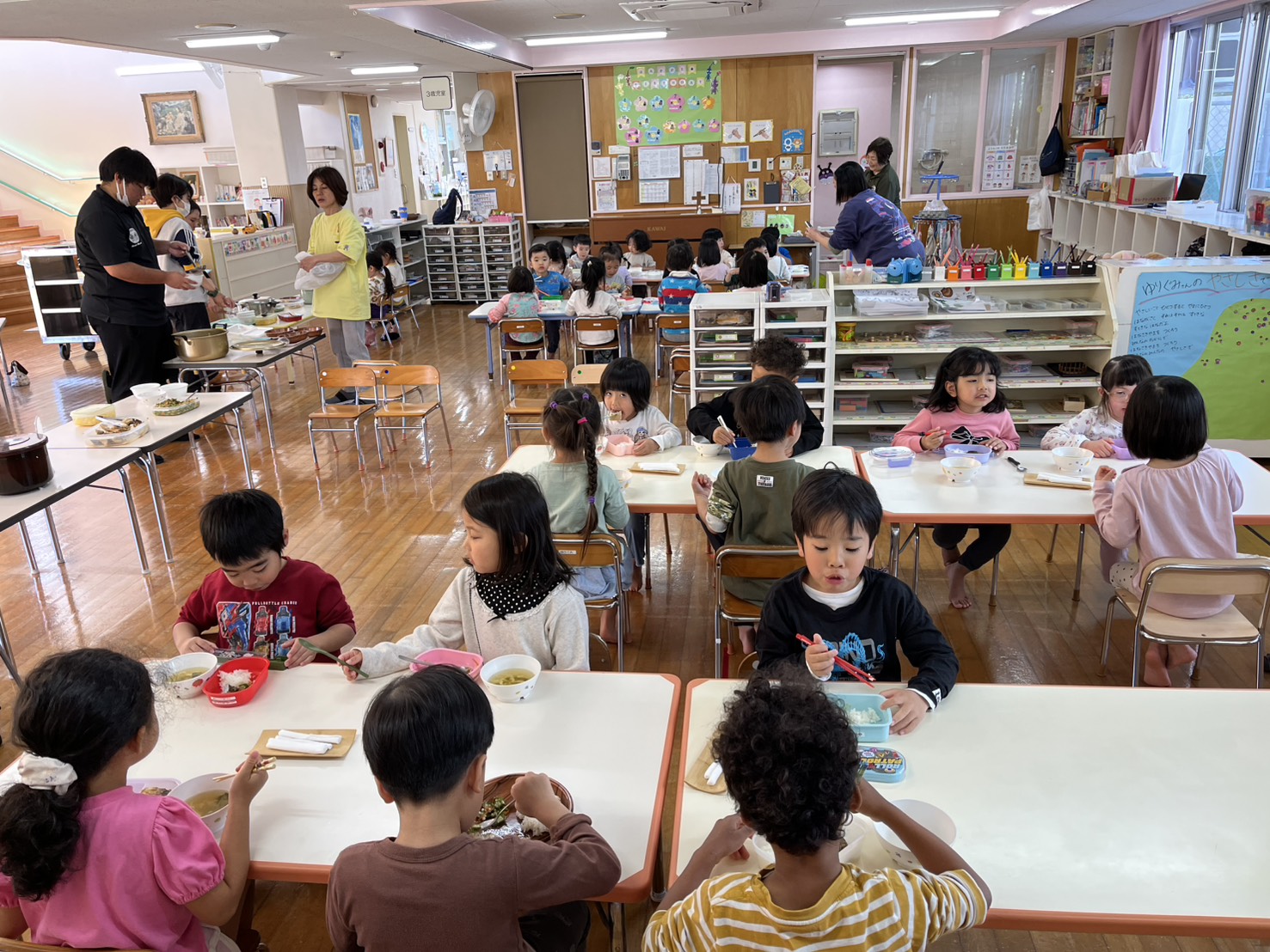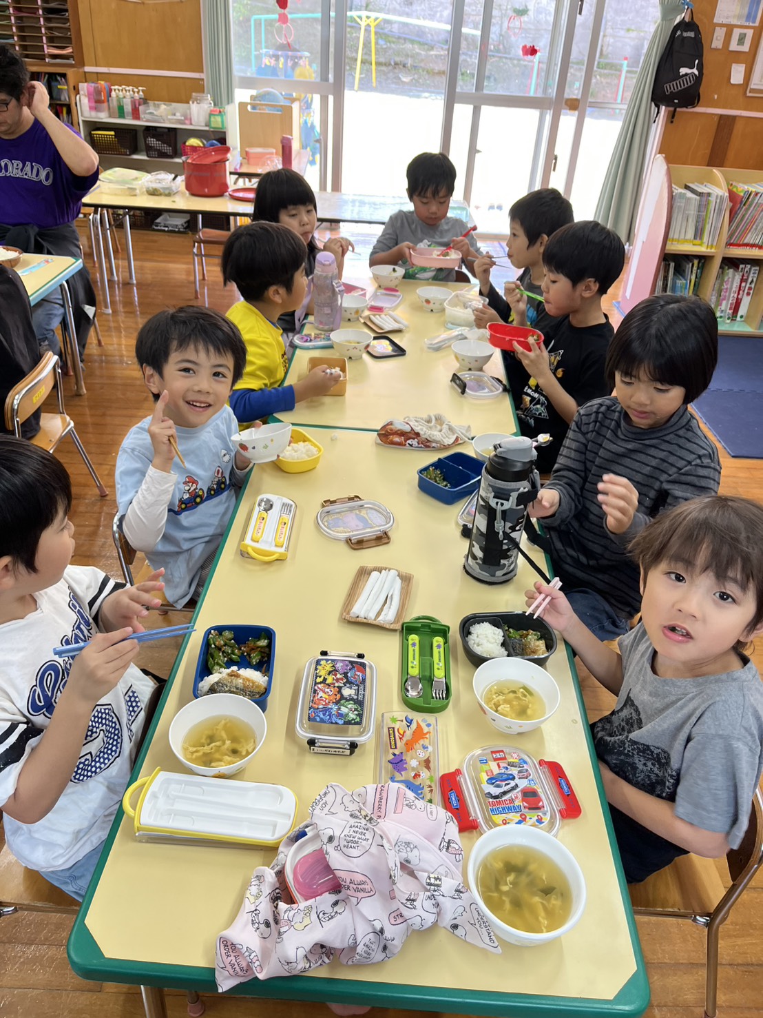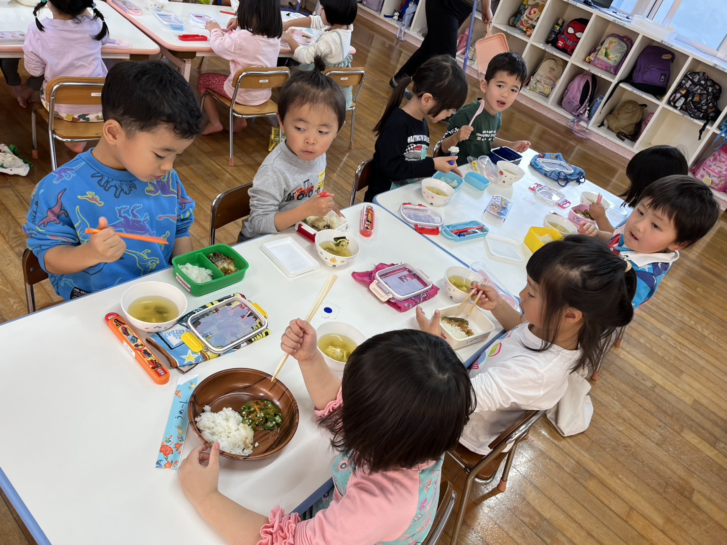 今日は、合同礼拝や園庭あそび、家庭から空の弁当箱を持ってきて自分で給食を詰めるランチボックスデー