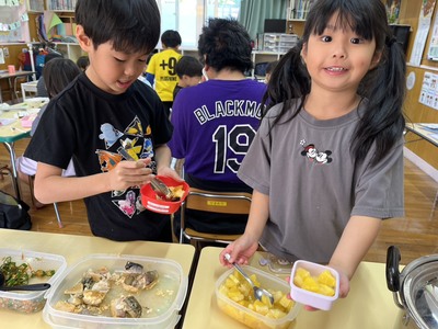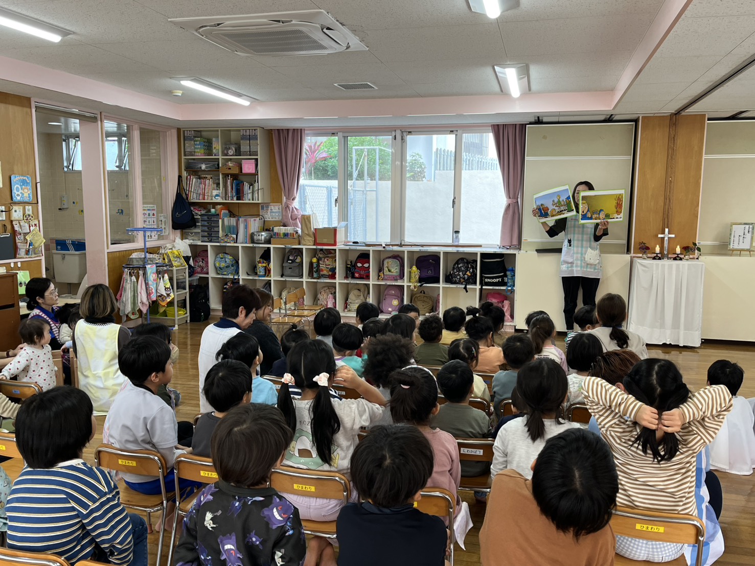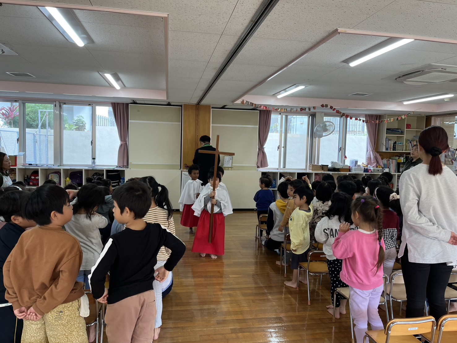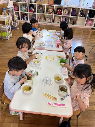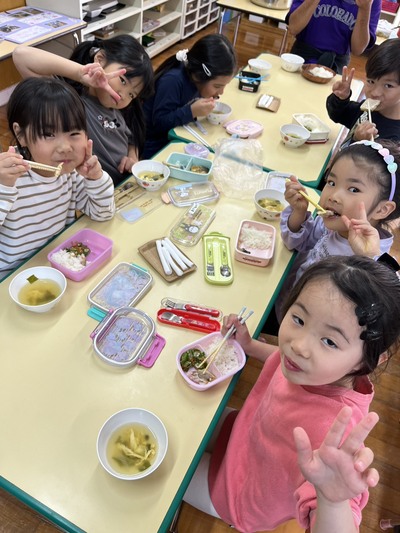 今日は、合同礼拝や園庭あそび、家庭から空の弁当箱を持ってきて自分で給食を詰めるランチボックスデー
