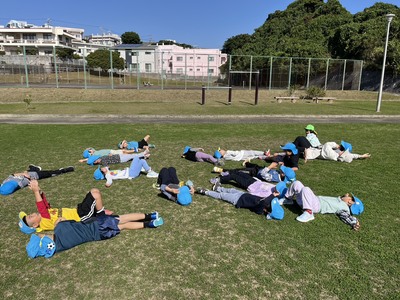 ☆ゆり・ひまわり組☆ 始まる前に、芝の上で横になりストレッチ~。