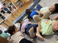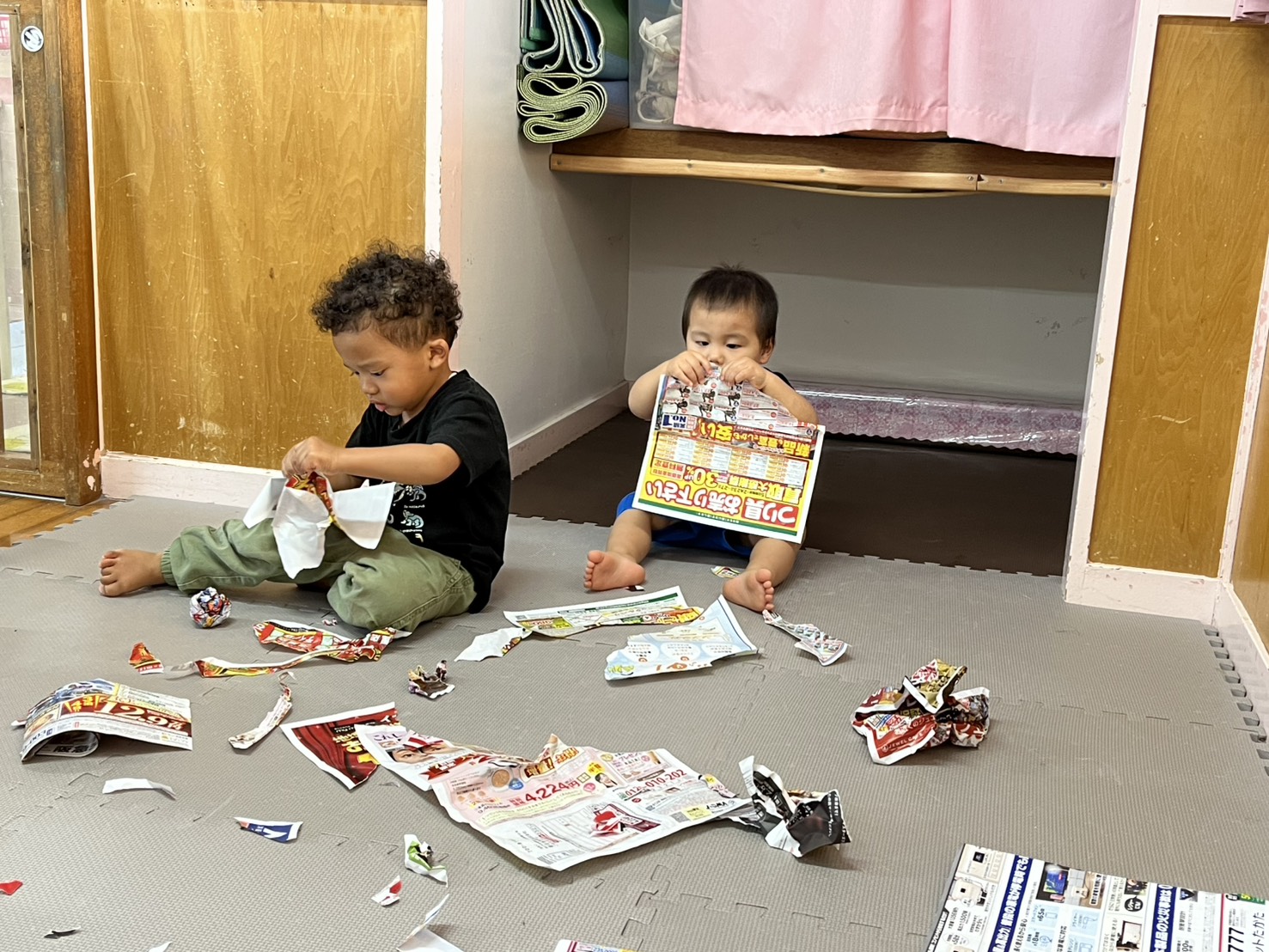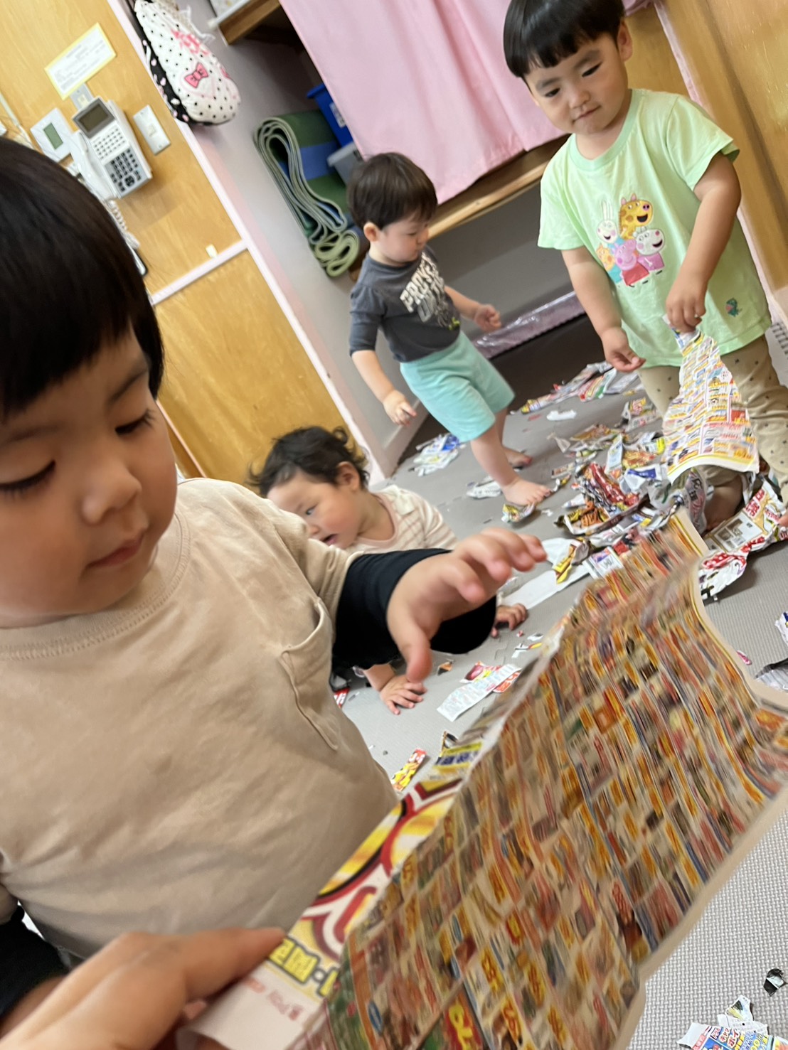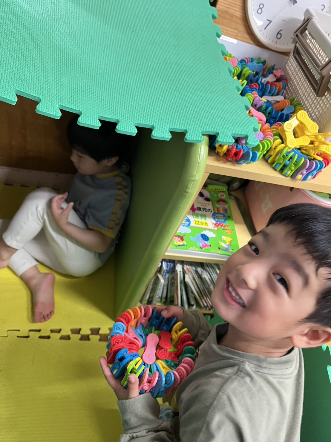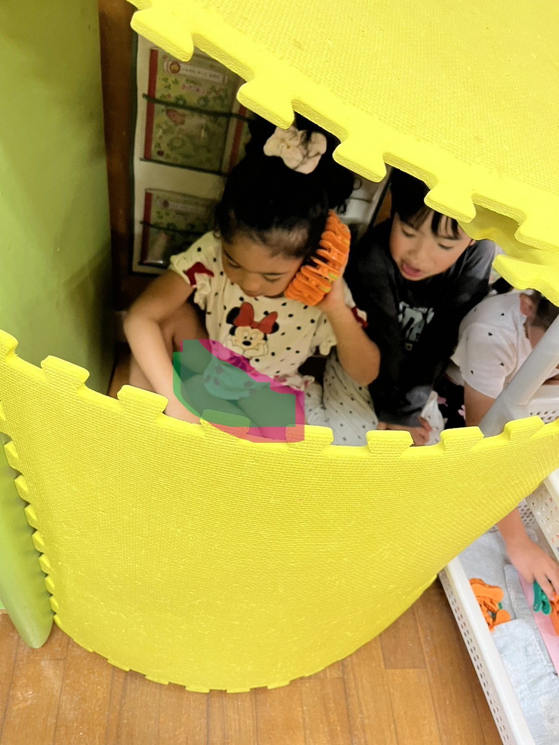 今日は雨の一日で、室内で過ごしました。保育室では、子ども達のアイデアで
