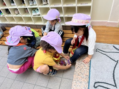 友だちを手伝ってあげる姿がありました。「はやくおさんぽいこー」と声をかけながらのやりと